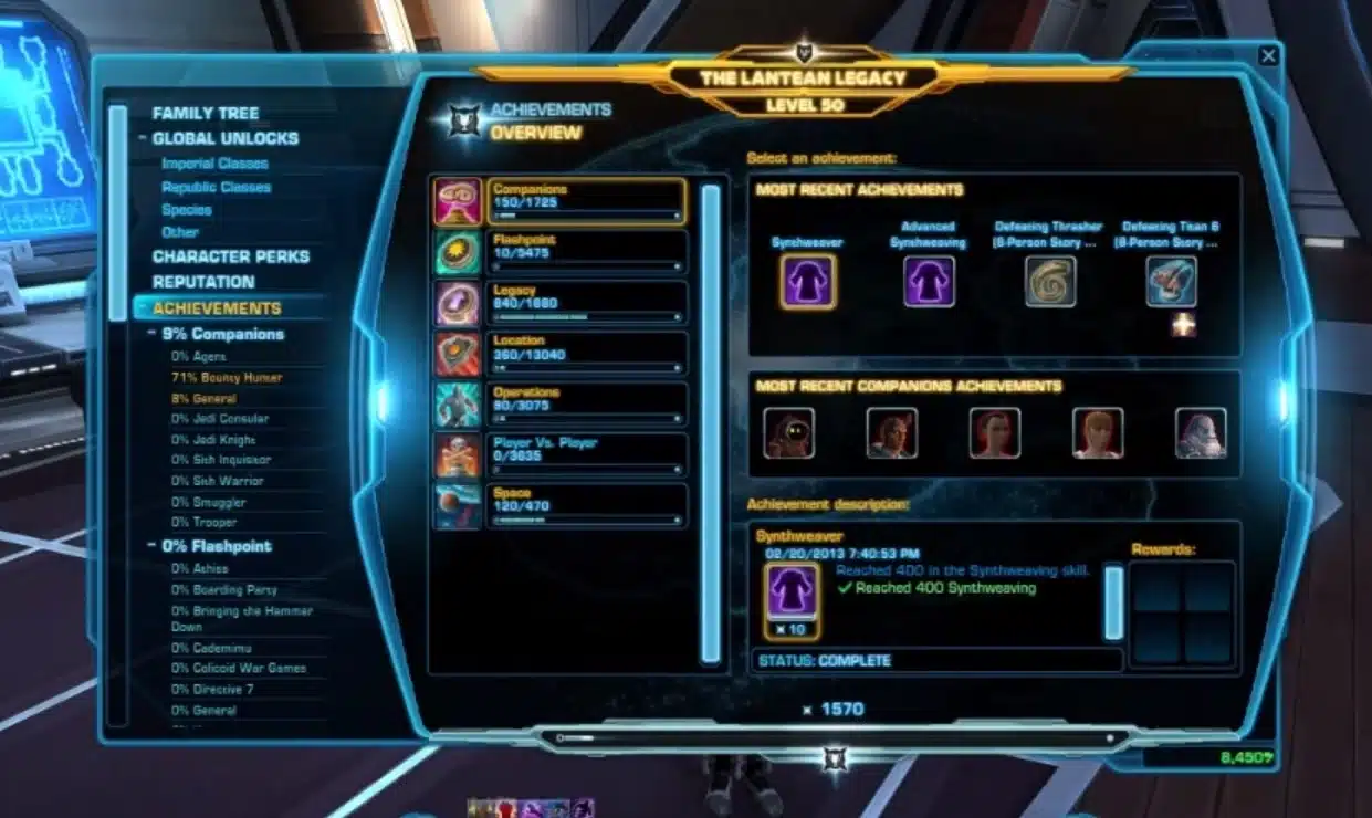 One exciting feature coming to SWTOR in patch 2.0 is the Legacy Achievements. MMORPGs are especially prone to building these new achievements to add more to the game. It’s a popular feature, especially in games in the past 5 years or so. It’s no surprise that SWTOR has them, too but the new update will have Legacy Achievements, meaning you don’t get them on just one character but on all of your characters who share a legacy.