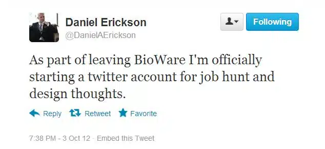 Well, now we stumbled across this Tweet and this new Twitter account from Daniel Erickson and it’s clear that he has officially left BioWare and is on the job hunt. So he has known for at very least, the month of September that he was leaving or was already gone.