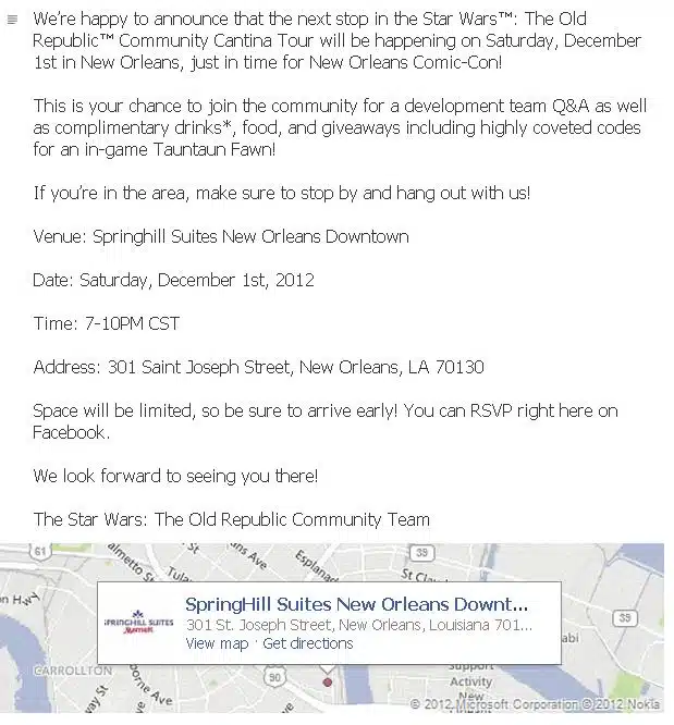 We’re happy to announce that the next stop in the Star Wars™: The Old Republic™ Community Cantina Tour will be happening on Saturday, December 1st in New Orleans, just in time for New Orleans Comic-Con!