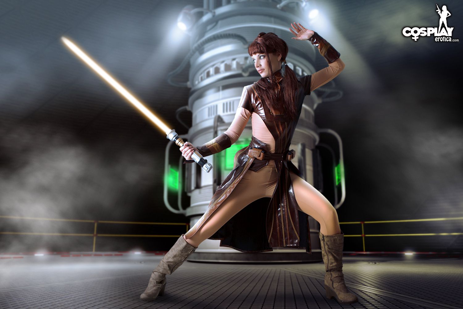 Bastila Shan in a masterful defensive stance brought to life by Superstar cosplay model Marylin for cosplayerotica.
