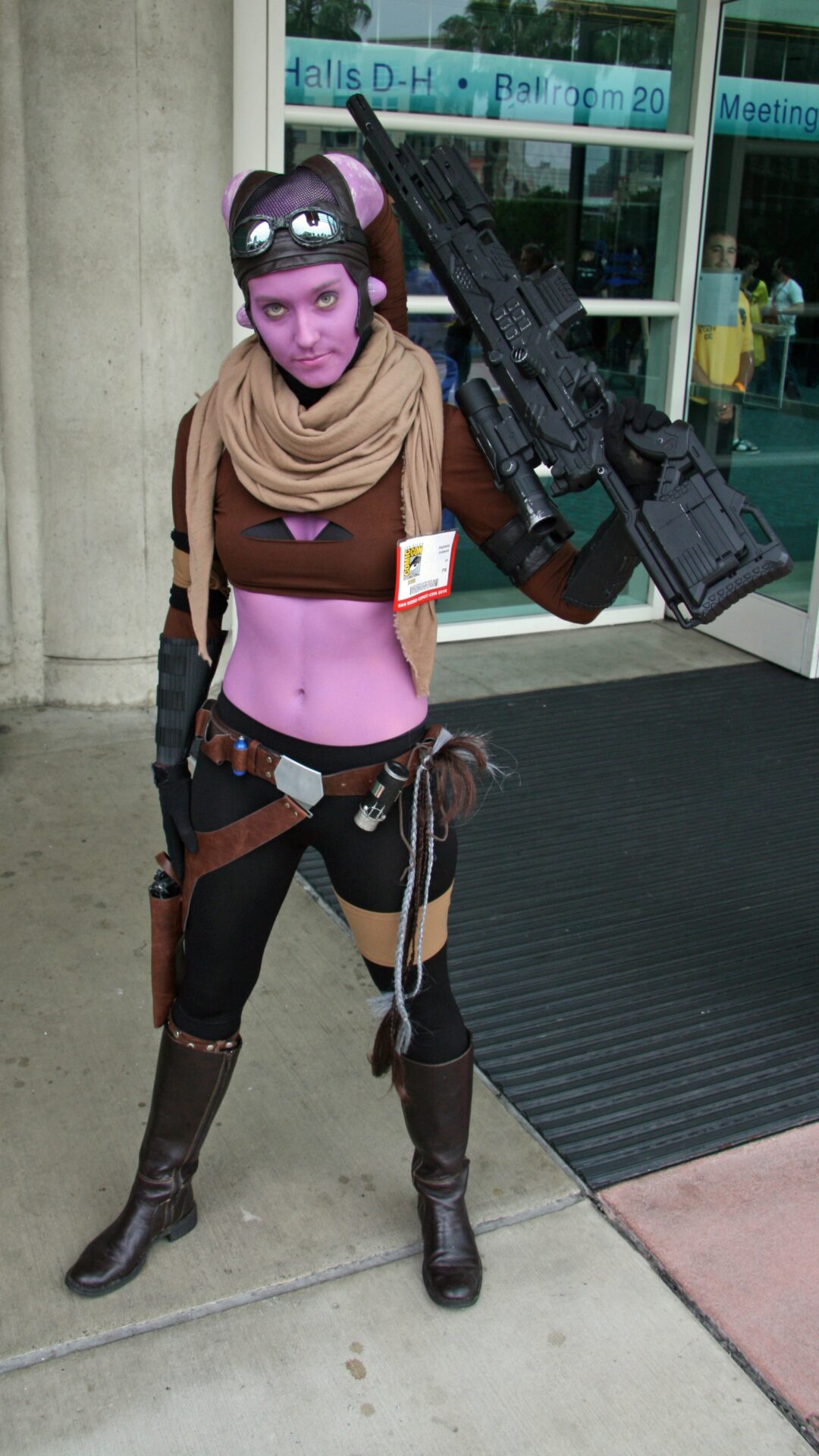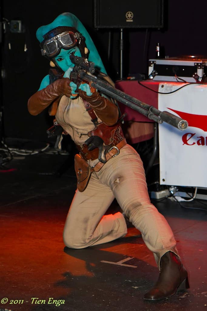 A Twi’Lek Bounty Hunter has you in her sites, by cosplay model, Pereprin and photographer, BlizzardTerrak.