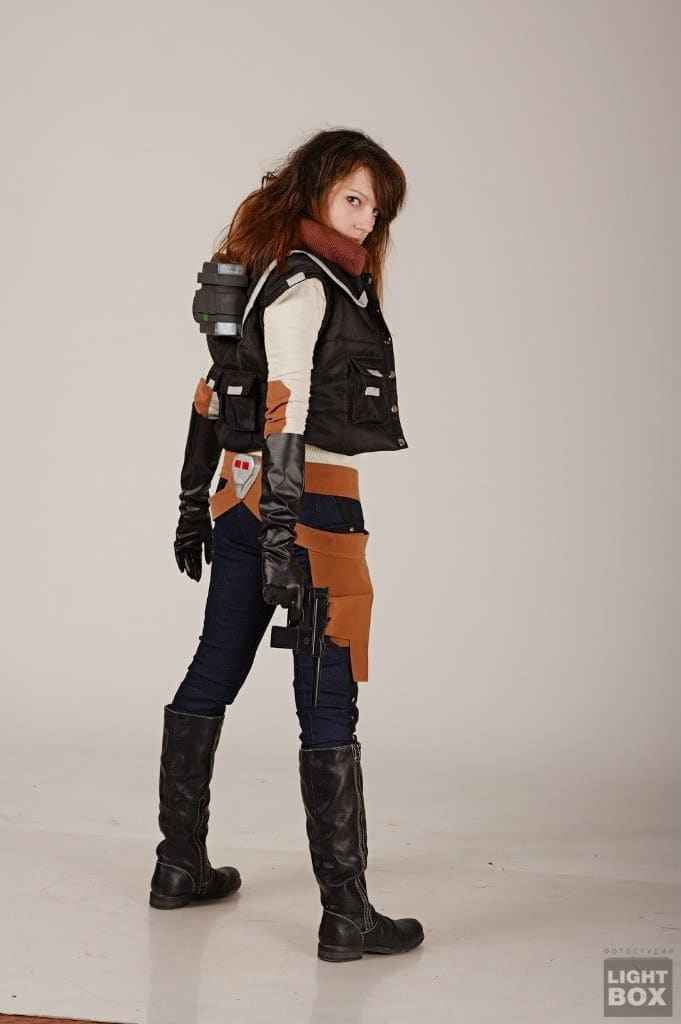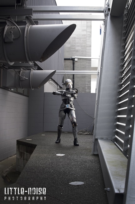 Ruthless Bounty Hunter, Shae Vizla honing in on her prey, by cosplay model Static-sidhe and cosplay designer Glittersweet.