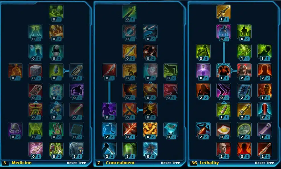 Imperial Agents in SWTOR can become one of two advanced classes at level 10, an Operative (DPS / Healing Class) or a Sniper (Ranged DPS). The Operative is a ranged DPS/Healing class with light armor. Operatives have three trees to choose talents from: Medicine (Healing tree), Concealment (DPS tree) and Lethality (a shared DPS tree shared with the Sniper Class).