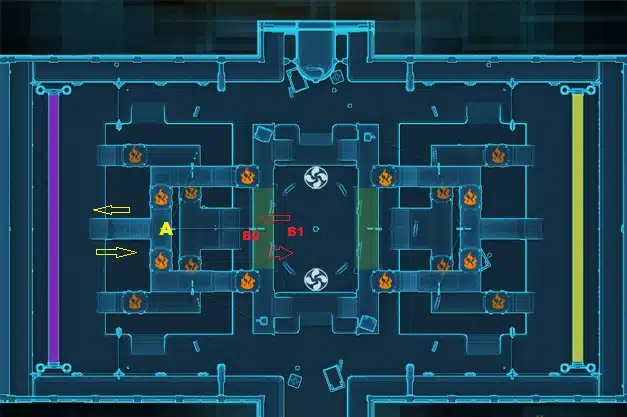 - Anyone (prefer… a tank) gets the ball at B1, crosses the acid UNTIL B2.