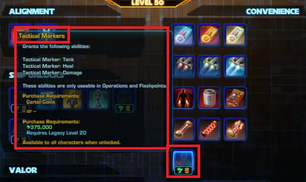 This is not the ability to mark targets. Anyone can do that. This is a marker that you place on the ground which has one of the role symbols like from group finder. They are available now as consumable items in cartel packs, and this is making them free and unlimited for a small one-time price (credits or CCs). This convenience item is legacy wide, not character perks, too! Which is what I’d have figured they’d do, for a credit dump.