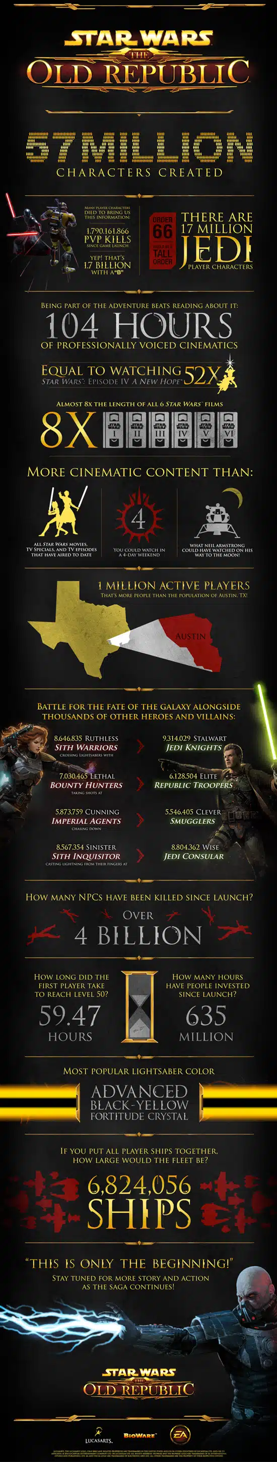 Bioware published a very nice infographic today providing random stats about the game and to thank SWTOR fans for their support. SWToR’s anniversary is approaching fast and the Austin-based developer is definitely increasing its community presence with frequent releases about Shadow of Revan and hopefully more reflections about the three years of the game’s existence.