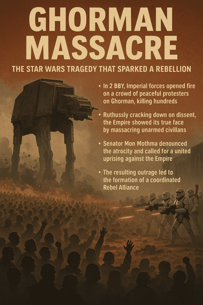 The Ghorman Massacre was a violent and heartbreaking event that took place in 2 BBY – just a couple of years before the Battle of Yavin (the climactic battle in A New Hope). In this incident, Imperial forces opened fire on a crowd of peaceful protesters on the planet Ghorman, killing hundreds if not thousands of unarmed civilians. It was one of the most brutal crackdowns of the Imperial Era, a clear example of Emperor Palpatine’s regime showing zero tolerance for public dissent. The massacre on Ghorman wasn’t just another footnote in the Empire’s reign of terror; it turned out to be the inciting moment for the Galactic Civil War.