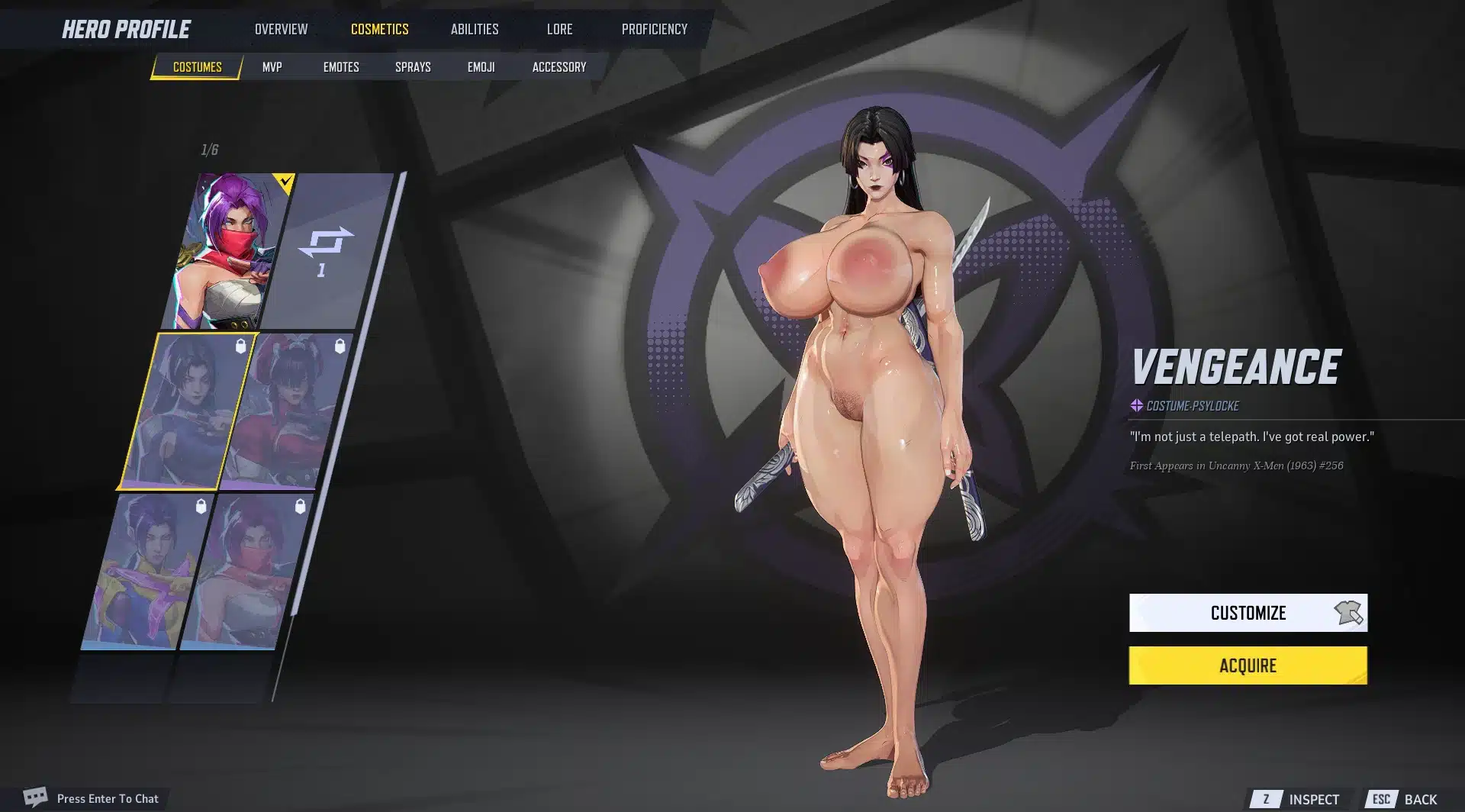 The Nude Sweat Psylocke mod transforms Psylocke into:
