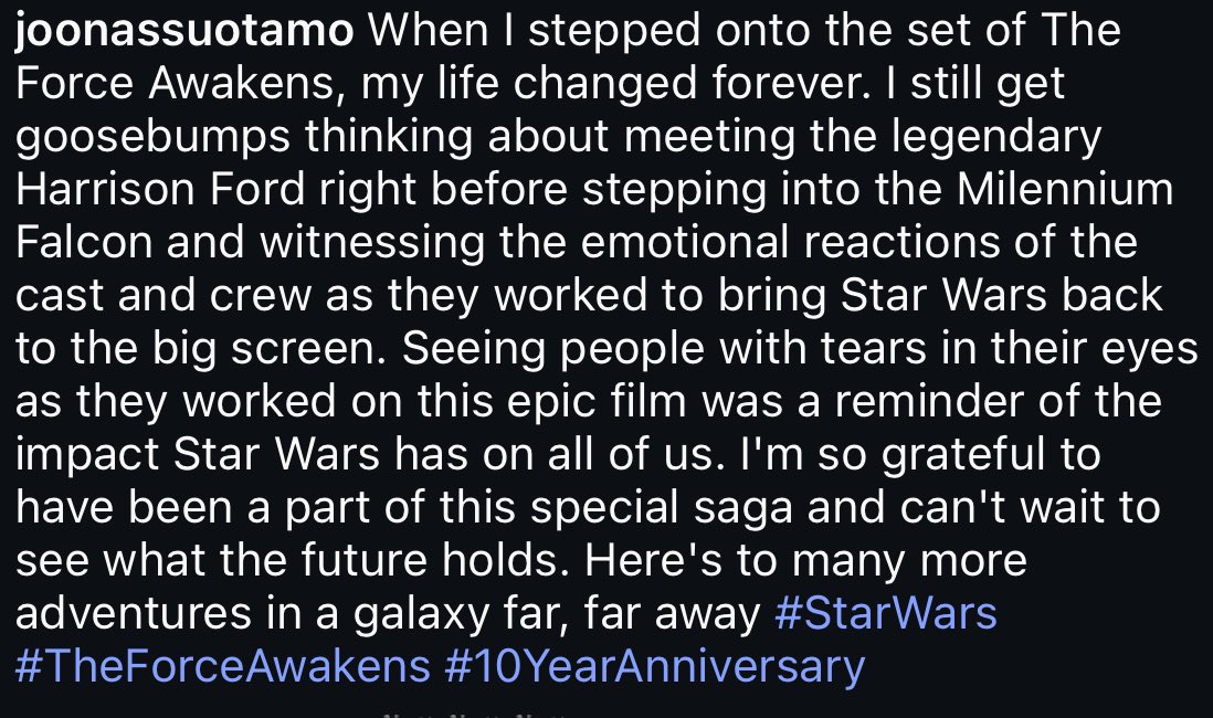 In a heartfelt anniversary post, Suotamo shared how walking onto the set of The Force Awakens quite literally changed his life—and how the emotion of that moment still hasn’t faded a decade later.