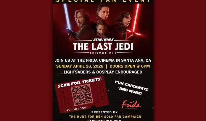 The Hunt for Ben Solo fan movement is heading to the big screen with a special screening of Star Wars: The Last Jedi at The Frida Cinema in Santa Ana, California on Sunday, April 26, 2026. According to the official event page, doors open at 6:00 PM and the film begins at 6:30 PM.