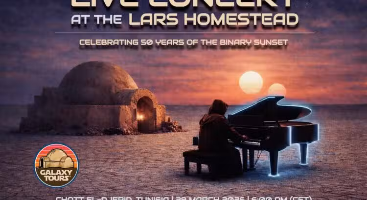 A free public live concert is set to take place at the Lars Homestead in Tunisia on March 29, 2026 at 6:00 PM CET, celebrating 50 years of the Binary Sunset scene. The event is being hosted by Galaxy Tours, with pianist Micah Anderson performing at the site made famous by Luke Skywalker’s defining look toward Tatooine’s twin suns.