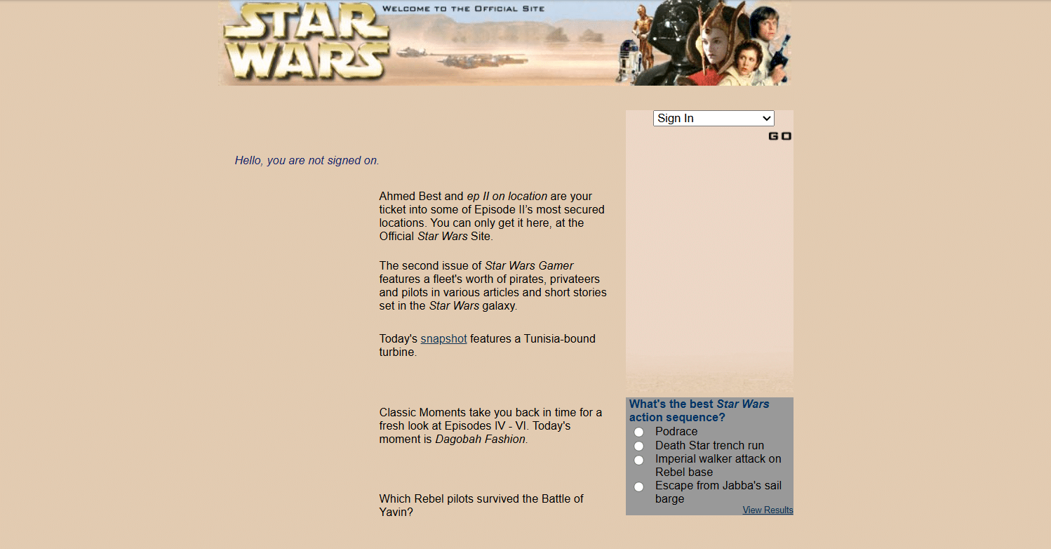 And honestly, that first version has real “we made this in a room full of very excited adults” energy. It wasn’t trying to be a giant content machine yet. It was there to give fans official information, basic Star Wars lore, and updates directly from Lucasfilm. That alone was a big deal at the time. Before social media, before YouTube, before every franchise had a 24/7 content pipeline, this was the official digital front door.