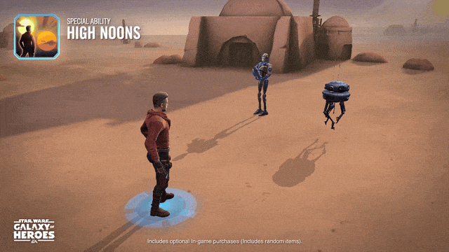 It gets even louder in Territory Battles, where the official reveal says High Noons dispels debuffs from allies, stacks Max Health, boosts Constable recovery and Turn Meter, reduces incoming Percent Health damage, cuts its own cooldown by 6, and can even revive all allies if it gets a kill. So yes, the basic fantasy here is “local marshal with a blaster.” The gameplay fantasy is much closer to “local marshal somehow turning a Tusken-Jawa task force into a rolling execution machine.”
