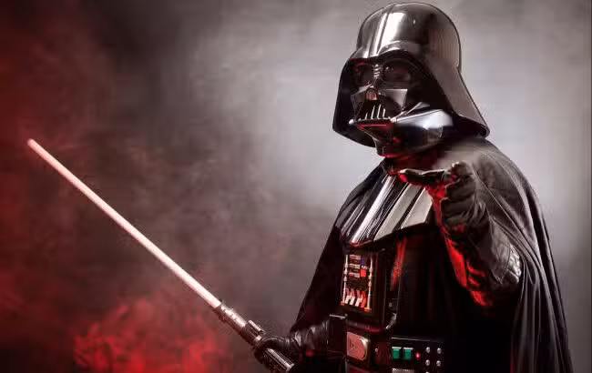 Darth Vader pointing with red lightsaber against smoky red and gray background